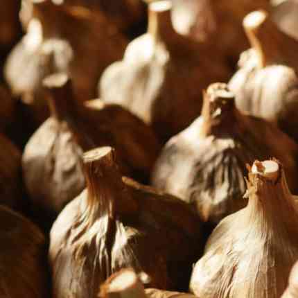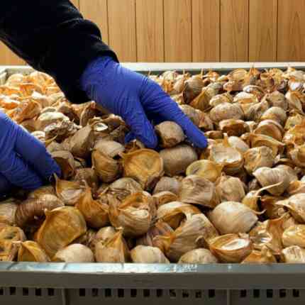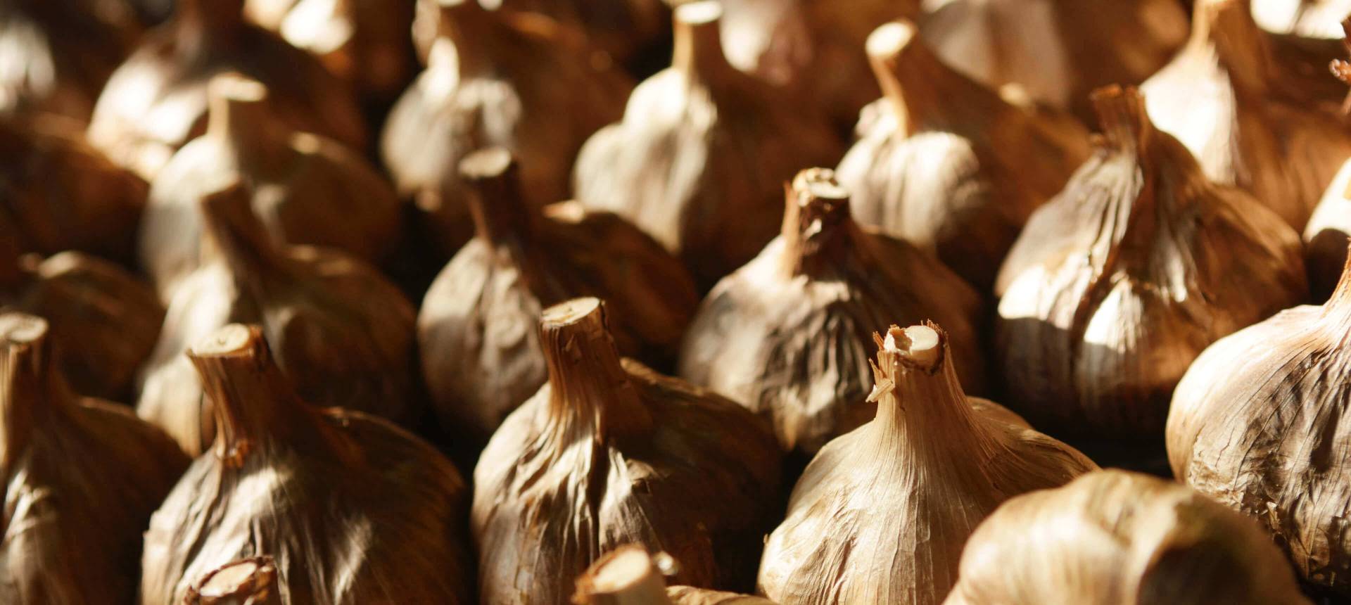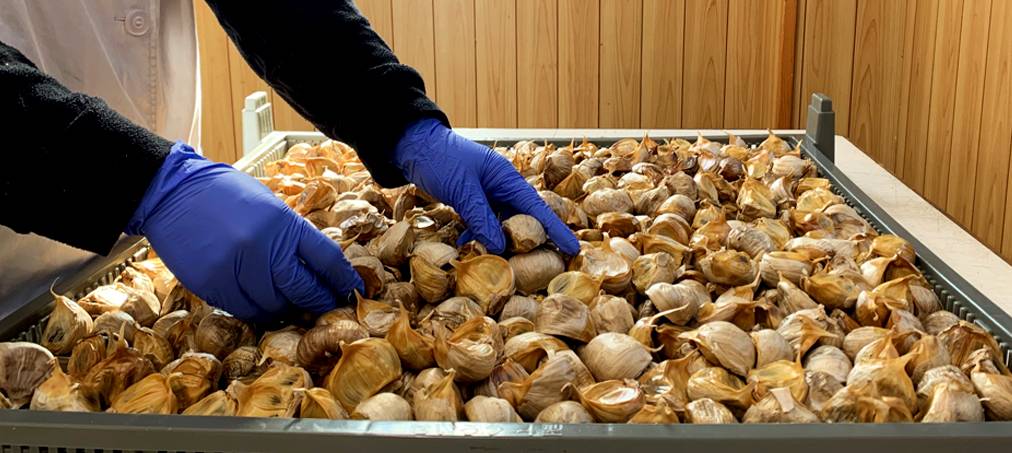 生のにんにくを、熟成室の中で温度と湿度をコントロールすることにより無添加・無加水で約1ヶ月熟成させたものが『熟成黒にんにく』です。